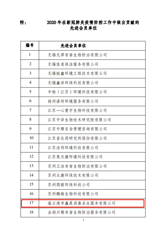 為弘揚有害生物防制行業(yè)的抗疫精神,協(xié)會決定對 2020 年積極參與新冠肺炎疫情防控消毒工作、在疫情期間積極捐款捐物、為疫情防控做出貢獻的先進會員單位給予通報表揚。